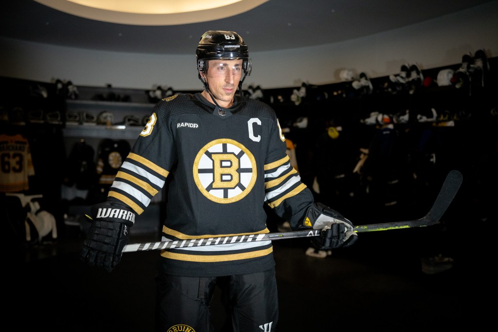 Brad Marchand, 27th captain of in franchise history, modeling the new home uniform for the 2023-24 “Centennial Season” of Bruins hockey. Photo courtesy Boston Bruins