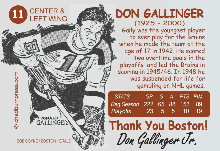 Don Gallinger joined the Bruins right of Jr. B hockey as a 17 year old in 1942. He scored two overtime goals in Stanley Cup competition and led the Bruins in scoring in 1945/46. But it all fell apart when as a 22 year old, a teammate introduced him to a Detroit gambling kingpin and Gallinger lost everything.