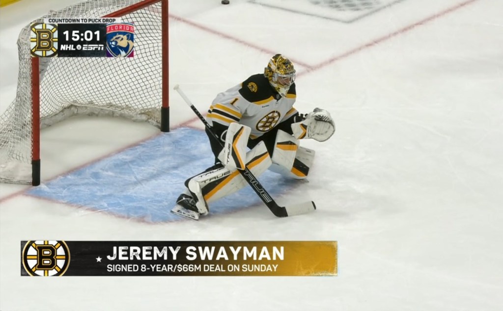Tonight’s ESPN telecast of the Bruins-Panthers season opener will provide many cutaway opportunities, the most of which will feature Swayman sitting at the end of Boston’s bench, a towel around his neck. Normally, goals against feature cutaway shots of the coach of the team that got scored on, tonight whatever gets behind Korpisalo becomes a cutaway to Swayman … paging Taylor Swift …