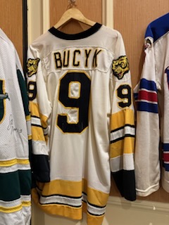 Above: A game-worn 1976-77 Champion edition Johnny Bucyk home white sweater worn that season in nationally televised games, as displayed during Saturday’s hockey jersey expo on the North Shore. Photo shared by Kirk Luedeke