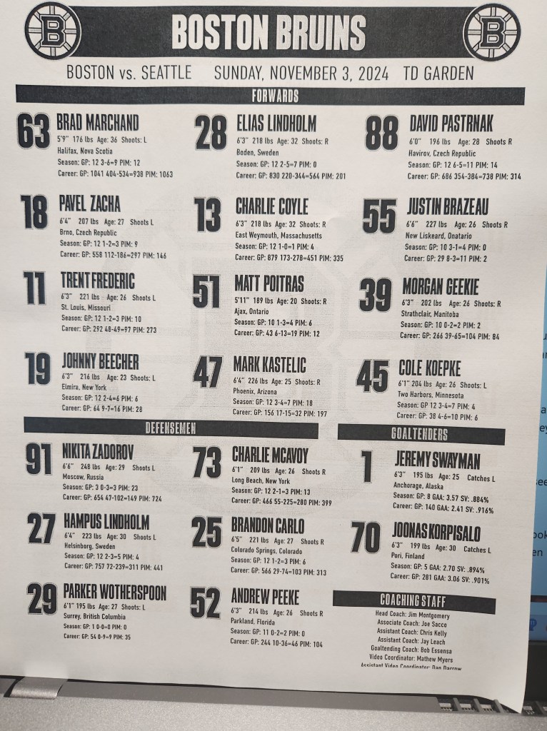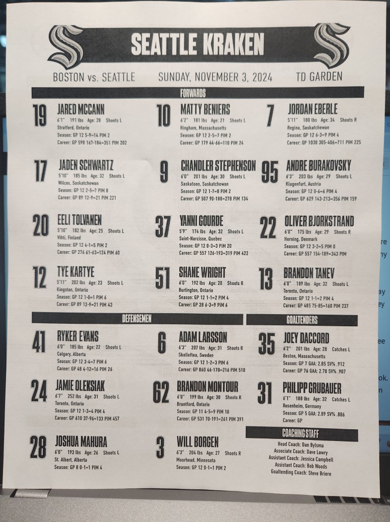 In net for the Kraken, Joey Daccord, the son of former Bruins goaltending coach Brian Daccord. Boston area native Matt Beniers centering in the Kraken’s starting lineup.