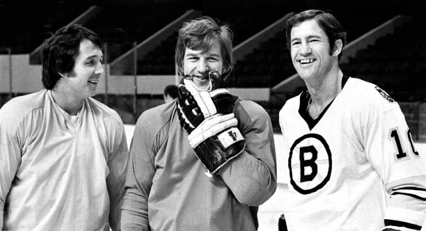 Bobby Orr, faking a forced smile while flanked by new teammates Brad Park, left, and Jean Ratelle in the Bruins’ first practice after the Nov. 7, 1975 blockbuster bringing the two New York Rangers (along with defenseman Joe Zanussi) to Boston in exchange for Phil Esposito and Carol Vadnais.