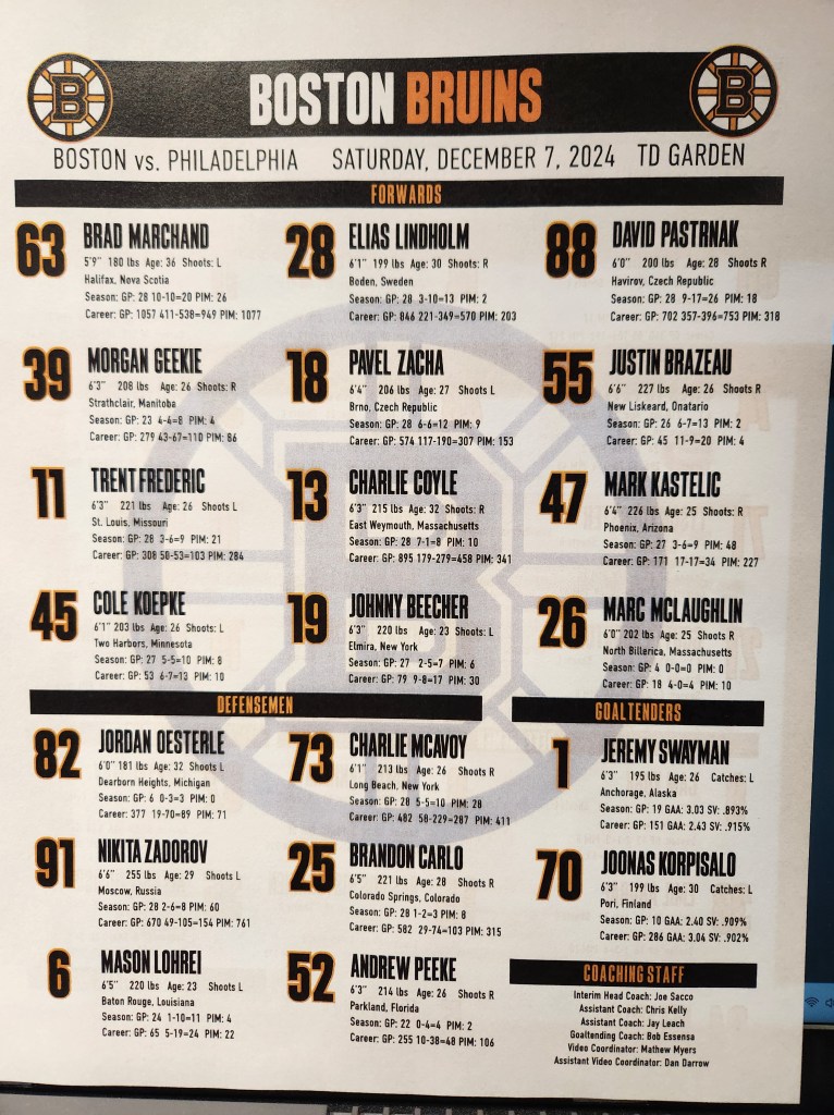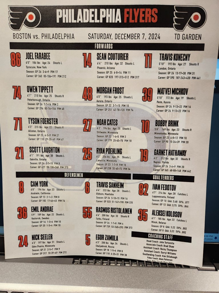 Jeremy Swayman vs. Aleksei Kolosov (maybe it’s me, but it seems it’s been Samuel Ersson every time for a while, but he’s out of the lineup as Philly has Belarussian and Finnish netminders, Kolosov and Ivan Fedotov, in uniform today.