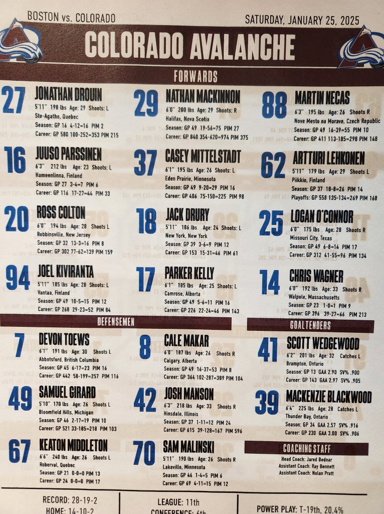 The Avalanche have allowed 153 goals in 49 games this season, ranking the Avs at the seam between the middle and bottom thirds of the NHL. That the Bruins, through 40 minutes, have only managed eight shots on Colorado starter Scott Wedgewood (2.90 GAA, .900 SP in 13 GP) has to be unsettling to Boston mgmt.