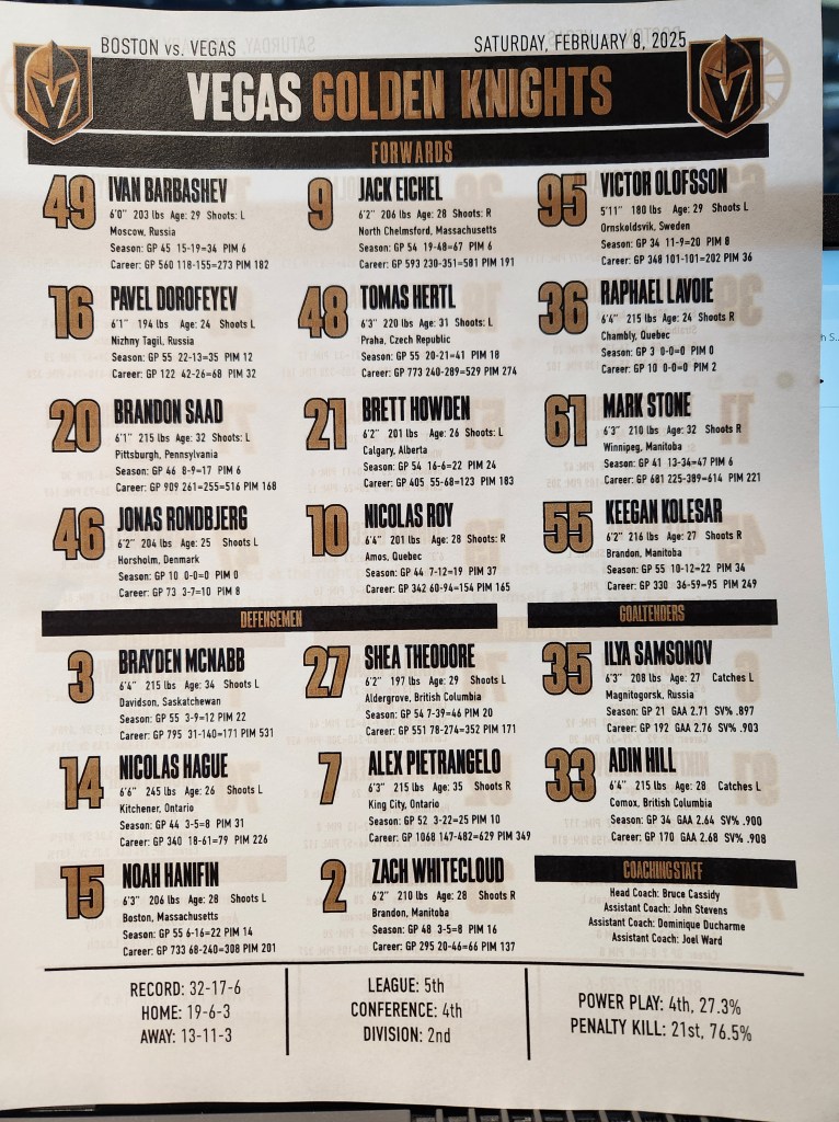 Coming in at 32-17-6, the VGK’s sit second in the Pacific Division, wedged between Edmonton and Los Angeles. The Bruins, who 56 games played are second in the NHL only to the 57 played by the Colorado Avalanche, are out of the playoffs and needing to make hay with fewer sunshines remaining than their competition for one of the two Wild Card playoff spots in the Eastern Conference.