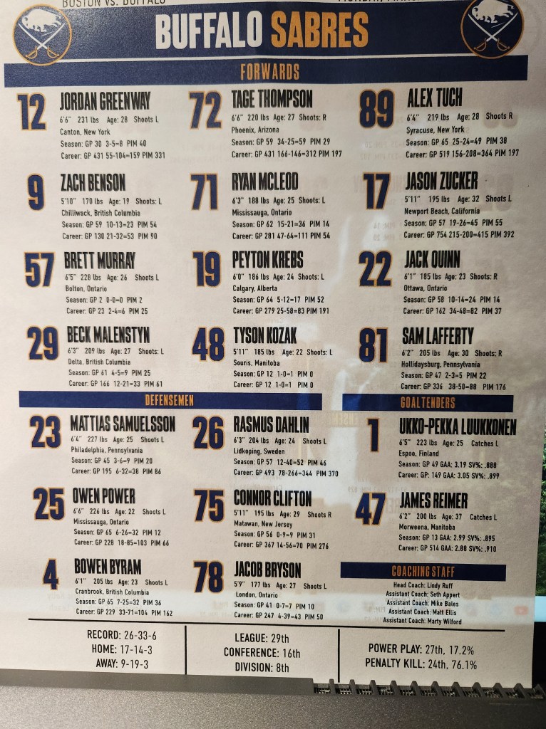 The Sabres, perhaps woken up by Zadorov’s annoying muscle and mouth, are playing a better second period. Korpisalo took a high, one-timer (we think it was Tage Thompson) off the padding high on the chest, and at the other end Luukkonen stopped Pastrnak on a breakaway.