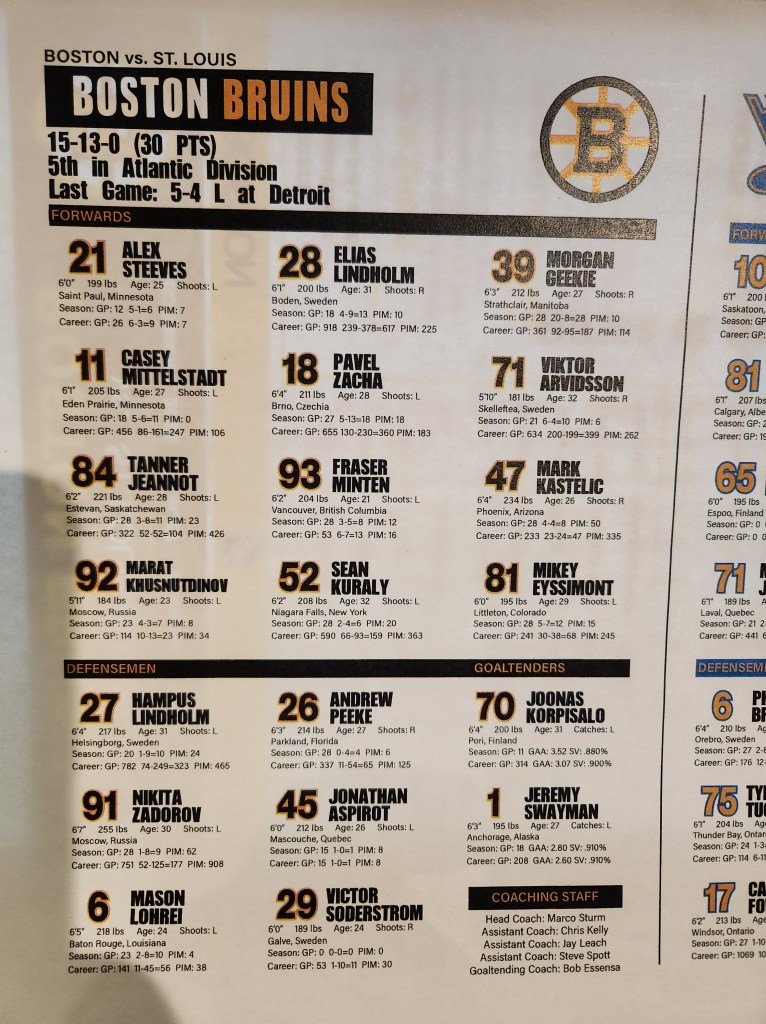 It’ll be Jordan Binnington against Joonas Korpisalo tonight on TD Garden ice, all 200×85 feet of it, as the St. Louis Blues visit the Boston Bruins tonight. Extraordinary goaltending, a component of some outstanding records posted by the Bruins in recent years, has been essential to wins over two segments of the 2025-26 season, including this one where Boston’s two best players are injured and others are either out of the lineup or just getting back into synch upon their returns from injury.