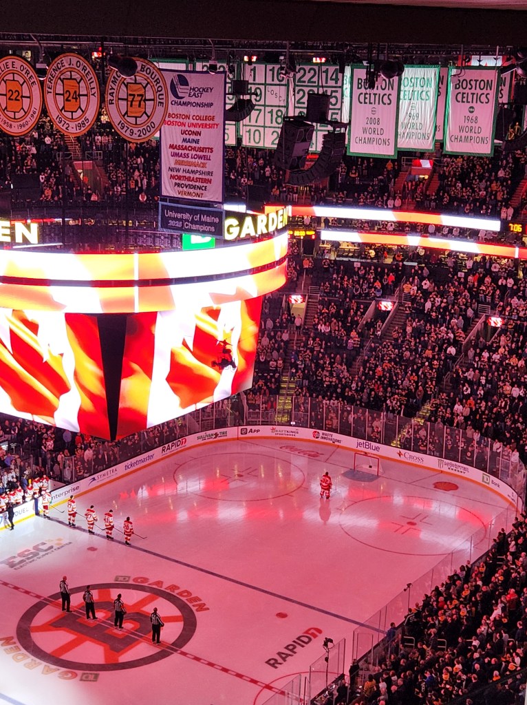 During “Oh Canada,” the Calgary Flames correctly lined up to face the Canadian flag at the west end of TD Garden. Almost all teams face east toward the American flag for both anthems.